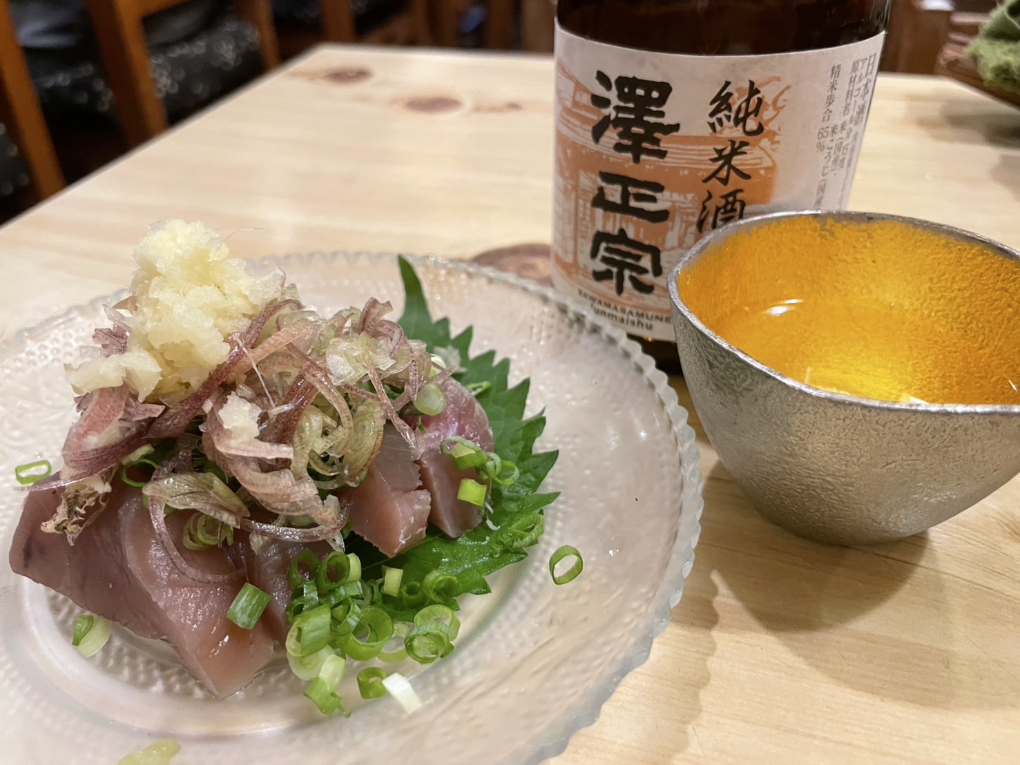 薬味と共にいただくカツオは、身が引き締まっており、口に入れるととろけるような旨味が広がります。この力強いカツオの旨味を、「澤正宗」が優しく包み込み、後味をすっきりとさせてくれます。お互いの良さを引き出し合う、まさに理想的なペアリングです。