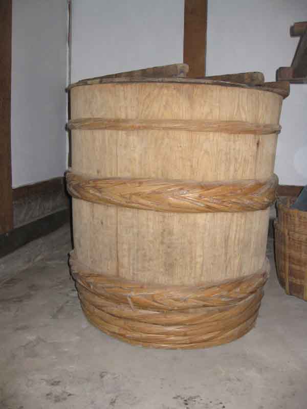 我が社では、大正時代より漬物倉があり、多くの漬物を漬けていました。主に季節の酒造りの方々が冬は、泊り込みで働いていてくださいましたので、多くの漬物や、味噌、醤油を自家生産していました。3尺の桶が4本ほどあり2本には味噌、2本には青菜の漬物や近江漬けが入っていました。