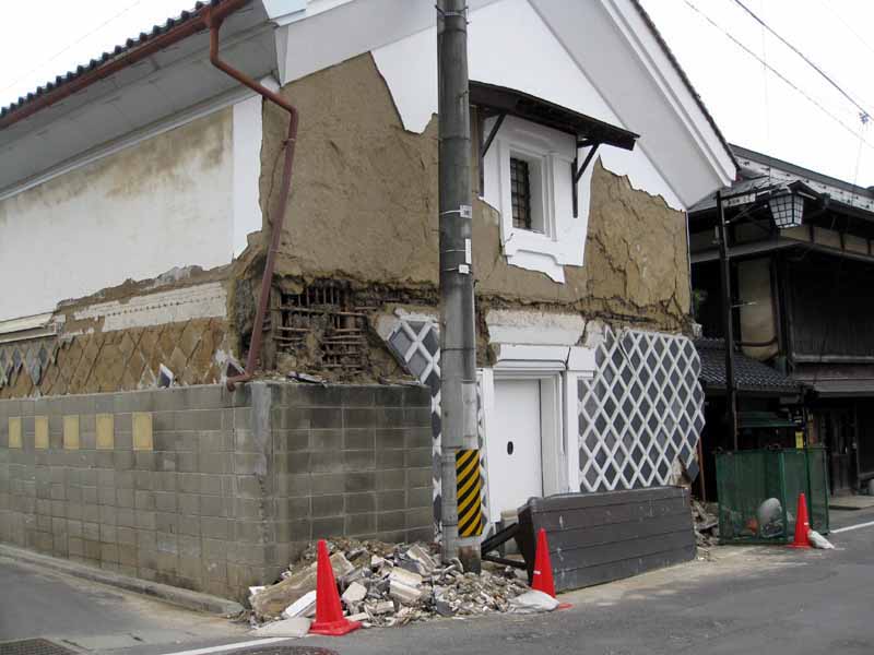 例会場のホテル虎屋に着きましたら、ホテルは休業中、外壁のタイルは剥離し、前の歩道は波打ち、惨憺たる被害でした。近くの土蔵は崩れ、神社の鳥居は上の部分がなくなり、屋根瓦はそっちこっちブルーシートで覆われていました。