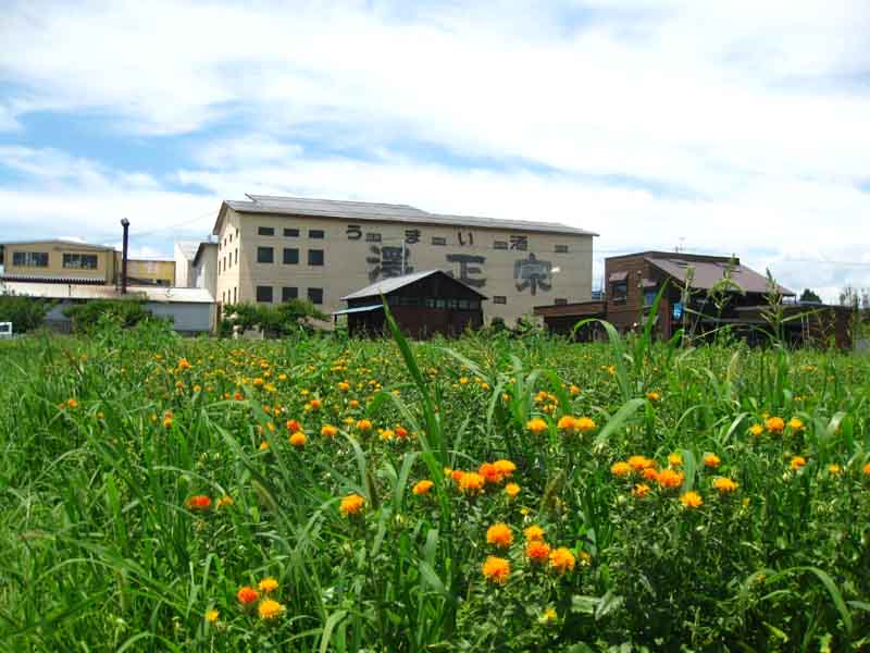 でもついに咲きました。酒蔵をバックに紅花が咲いています。