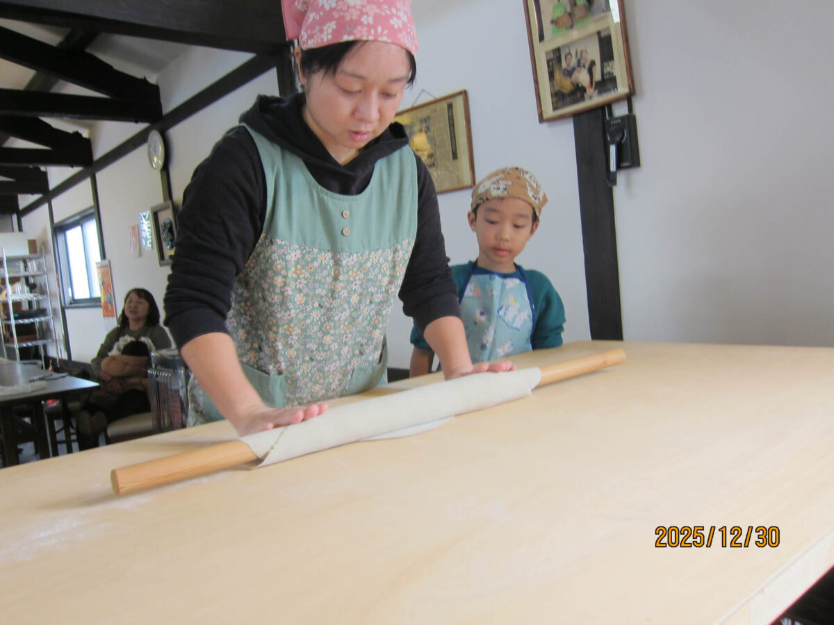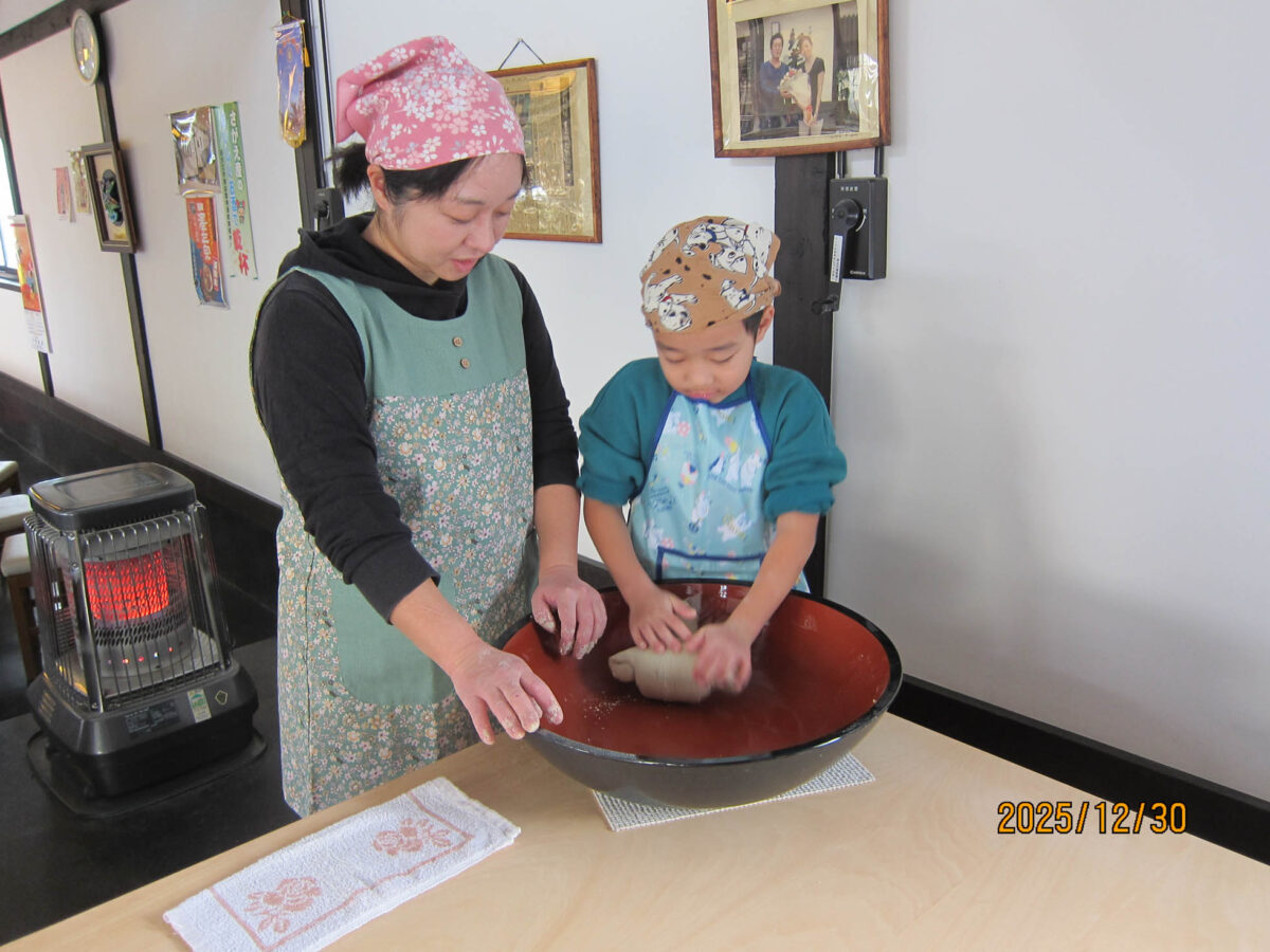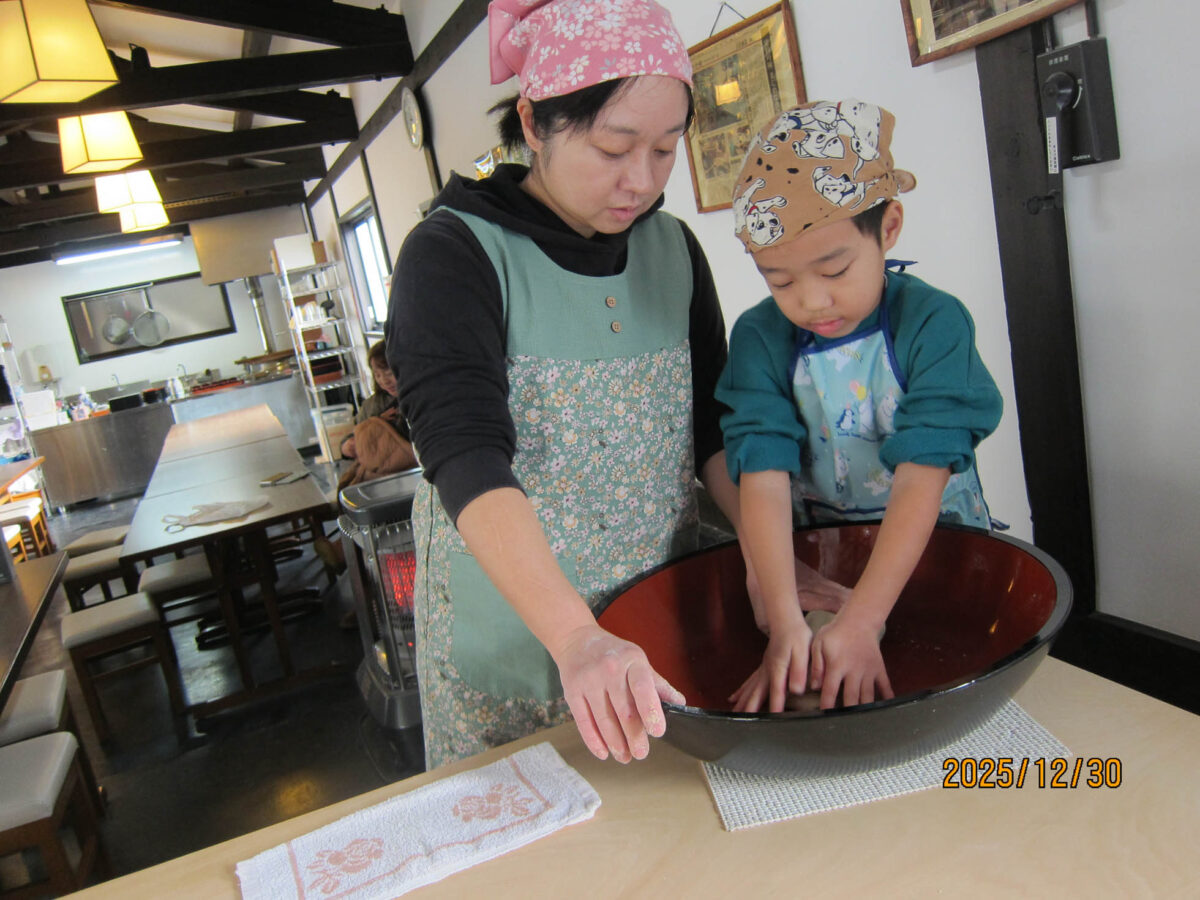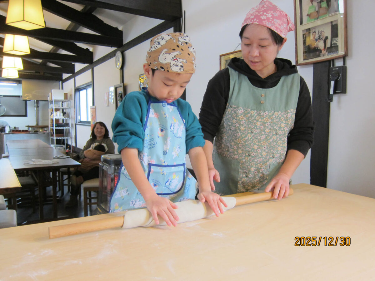 一方、2年生の男の子はお母さんと一緒にそば打ち。