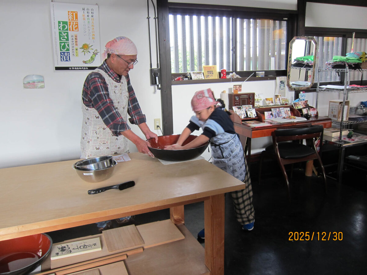 先日、地元のご夫妻と、東京に嫁がれた娘さんご家族が、そば打ち処紅葉庵にそば打ち体験に来てくださいました。
