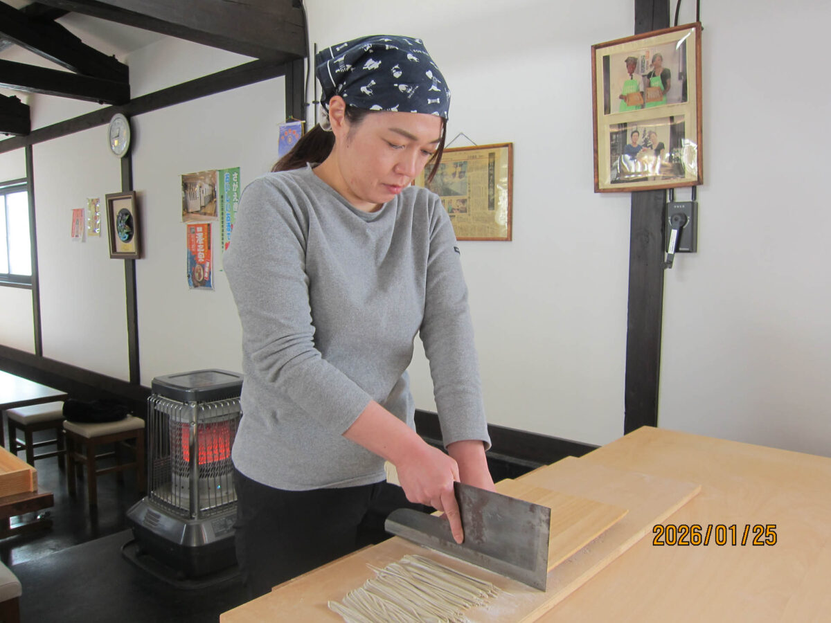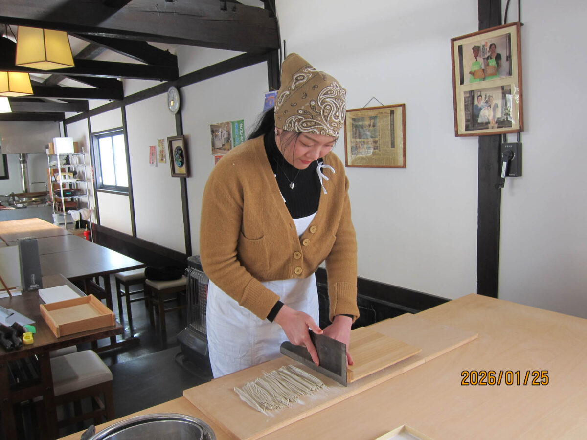 紅葉庵でのそば打ち体験では、そば打ち・延し・切りの工程すべてがとても上手で、初めてとは思えないほどの腕前。集中しながら丁寧に作業される姿が印象的でした。